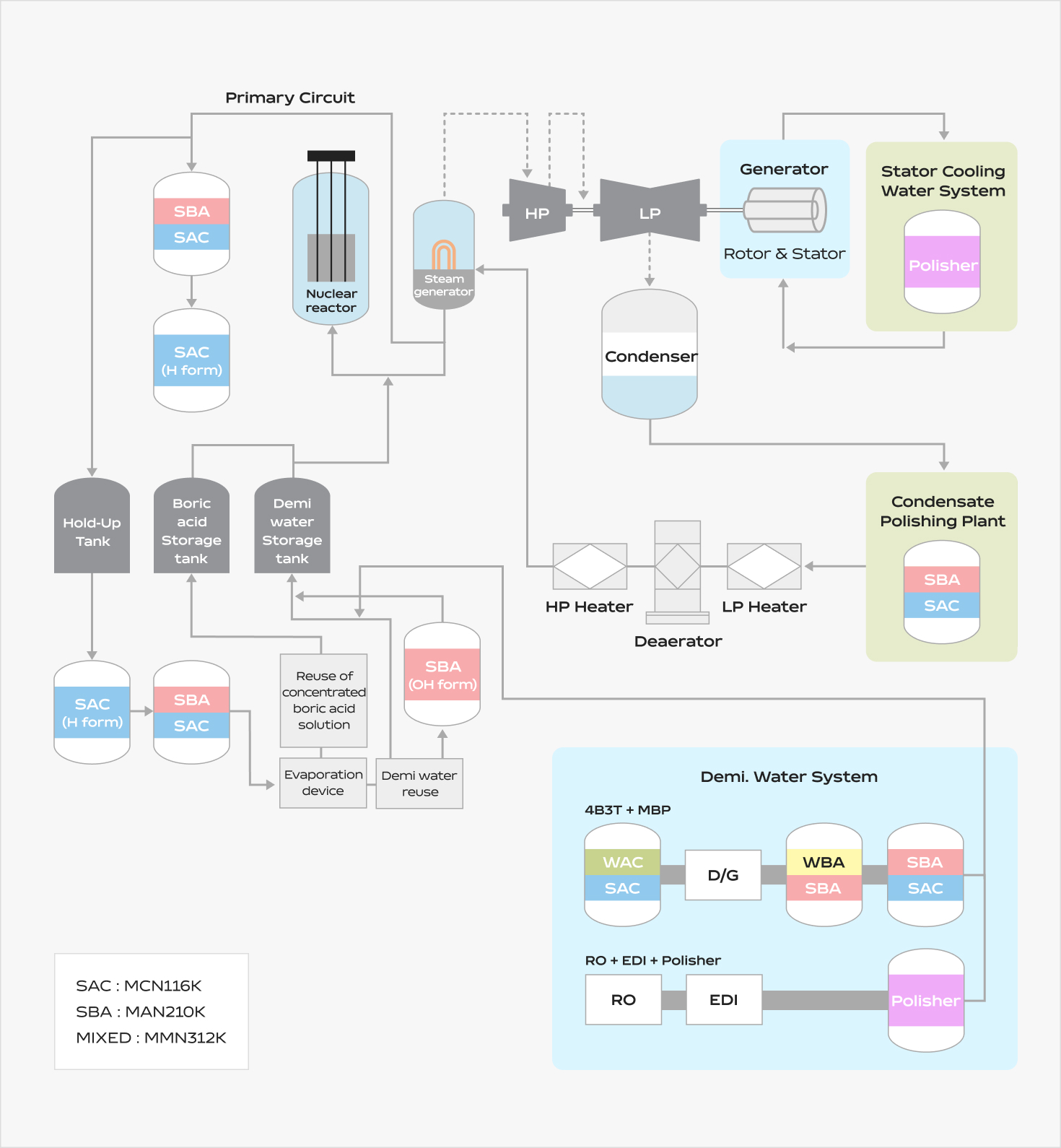 The water treatment flow for PWR nuclear power plants typically consists of two stages, including the primary circuit and make-up systems, as well as the condensate treatment in the secondary circuit. The ion exchange resins used in the primary circuit must be highly cross-linked resins and have low impurity content and high physical-chemical strength, as they may be exposed to radiation. TRILITE® ion exchange resins have a diverse delivery record in domestic and international nuclear power plants and are contributing to our customers' competitive power supplies through stable quality control and timely delivery.